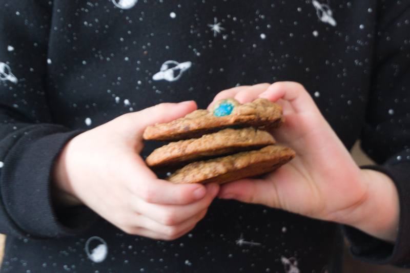 I really wanted a hot, freshly baked, chocolate chip cookie. We enjoyed my experiment so much I made a second batch with the boys, but made them “gourmet”. I let the boys chose which M&M’s and they chose peanut, peanut butter and a few of the plain ones. They were the perfect “New Year Party” cookies.