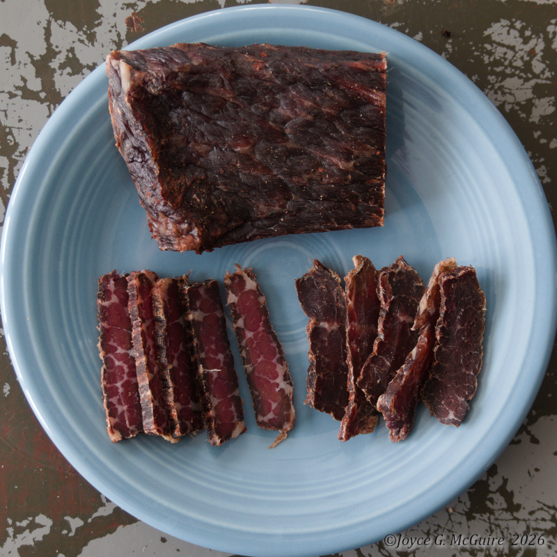 Piece of uncut biltong on top. Redder meat on left is dried to 55% and darker is closer to 60% dried.