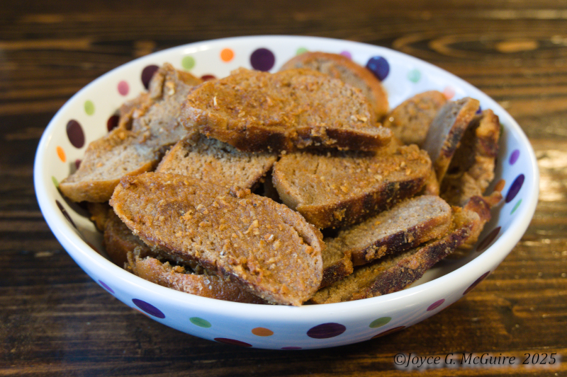Instead of buying our normal bagel chips, we attempted to make our own. We made our simple bagel recipe replacing the whole wheat flour with rye flour. We should have added some molasses for color. Then we cut the cooked bagels into thin slices and dehydrated. Easy! The hard part is keeping the kids away from snacking on them.